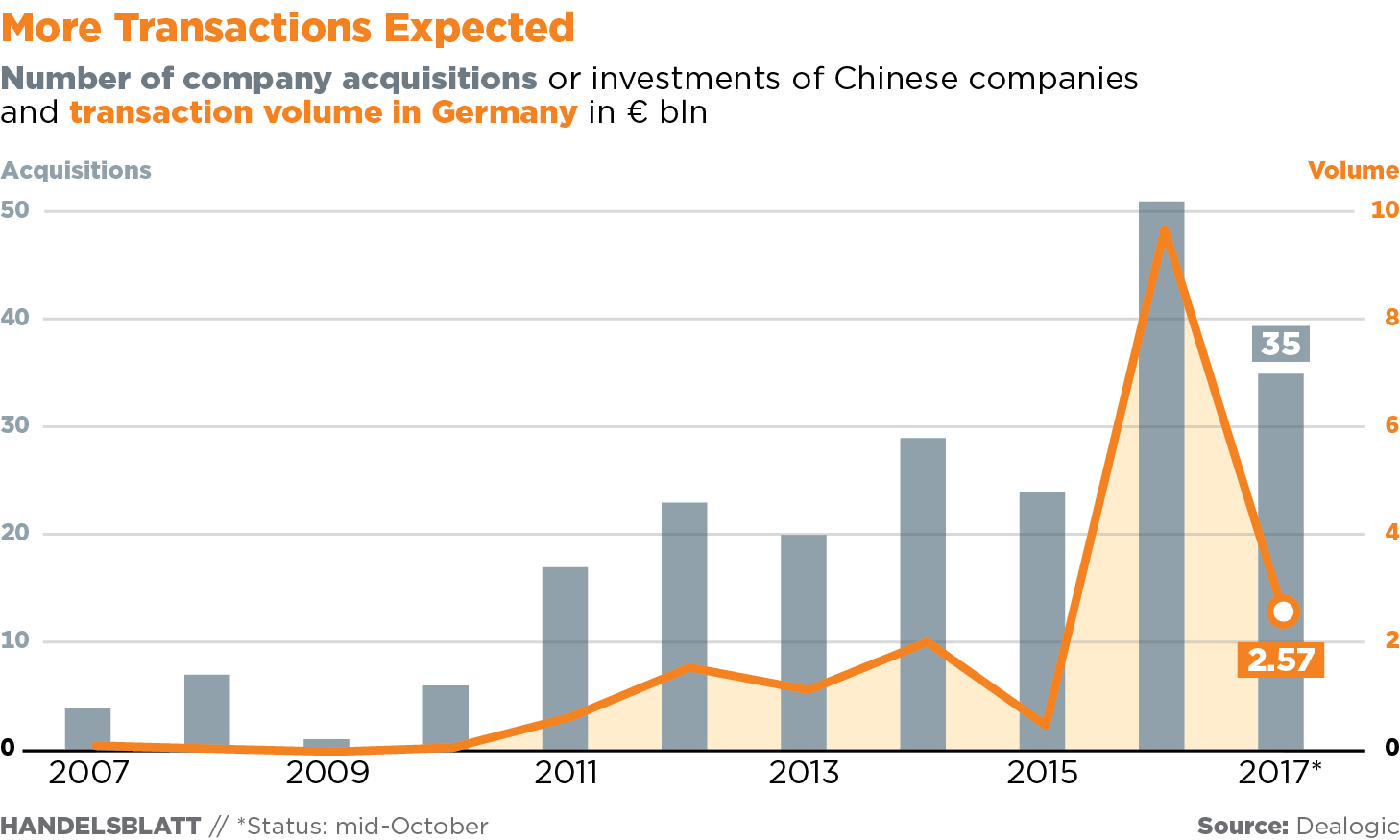 Bez obzira na to, investicioni bankari, advokati i konsultanti koji gaje bliske poslovne veze sa kineskim poslovnim miljeom uvereni su da novi talas preuzimanja evropskih firmi brzo narasta. Cilj nosećeg industrijskog plana, skovanog u Pekingu, jeste da do 2025. godine modernizuje ključne sektore kineske industrije. Međutim, postizanje industrijskih standarda svetske klase iziskuje, pre svega – zapadnu ekspertizu. “Kontrole tržišta kapitala u Kini dovode samo do nekih poslova, čiji je broj nevelik. Bez obzira na to, kineski novac prisutan je u mnogim aktuelnim licitacijama. Ponuđači iz Kine su sada manje divlji, zreliji su i iskusniji”, rekao je Oliver Litkens (Oliver Lütkens), kopredsednik nemačkog odeljenja za preuzimanja pri Dojče banci (Deutsche Bank).