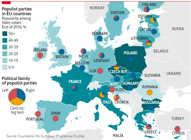 Ova “zaraza”, kako kažu politikolozi, uočljiva je širom evropskog kontinenta. Mark Rutte, liberalno-konzervativni holandski premijer izmislio je sopstveni stil političkog ponašanja, koje se razlikuje od “pogrešnog tipa populizma”. Uoči prošlogodišnjih izbora, njegova stranka, koju su pritiskali PVV i Forum za demokratiju – jedna nova nacionalistička populistička partija – bavila se reklamama u novinama, kojima je došljacima emitovana poruka „da se ponašaju normalno ili da odu”. Tereza Mej, njegova britanska koleginica, ujedinila je svoju partiju napadajući “građane niotkuda” koji “vaš patriotizam smatraju neprijatnim, vaše brige o imigraciji uskogrudim, vaše stavove o kriminalu neprosvećenim, vašu vezanost za sigurnost vašeg posla neugodnom” u govoru koji je komotno mogao poteći iz UKIP-a. U decembru su francuski republikanci izabrali Lorena Vokija (Laurent Wauqukuiez), evro-skeptičara koji se protivi gej brakovima i koji želi da imigraciju svede na “strogi minimum”, planirajući da njegova partija bude “zaista desničarska”. Nova demokratija u Grčkoj i GERB u Bugarskoj, suočavajući se sa konkurencijom iz ekstremno desničarske stranke Zlate zore i partije Zankina, pojačavši retoriku o imigrantima i drugim „spoljnim“ grupama.