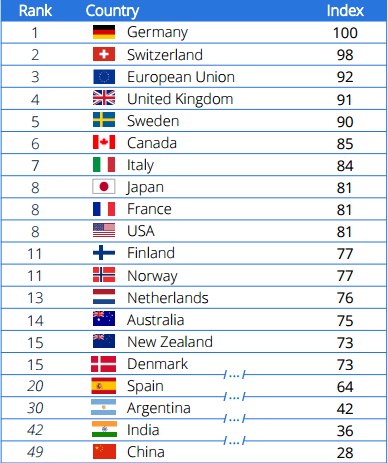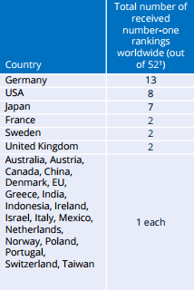 Tabela iznad predstavlja “Made-In” indeks koji je Nemačku listirao kao najomiljeniju zemlju među potrošačima širom sveta; iza nje je Švajcarska, a na trećem mestu je Evropska unija. Četvrta je Britanija a peta i šesta su Švedska, odnosno Kanada. Italija je sedma dok osmo mesto dele Japan, Francuska i Sjedinjene Države.