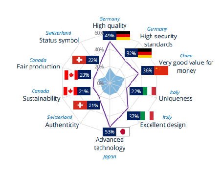 Proizvodi iz Nemačke najčešće se povezuju s osobinama visokog kvaliteta (49%), izrađenim po vrhunskim bezbednosnim standardima. Proizvode iz Kine globalni potrošači najčešće povezuju sa sjajnim odnosom kvalitet-cena (36%). Italijanski proizvodi prepoznaju se po svojoj jedinstvenosti i izvanrednom dizajnu. Japanski proizvodi su za potrošače simbol naprednih tehnologija (53%), što je najveći procenat koji je neka zemlja imala u ovom istraživanju. Švajcarska je na vrhu liste zahvaljujući svojoj autentičnosti (21%) i etabliranosti svojih proizvoda kao statusnih simbola. Proizvodi iz Kanade prednjače ispred drugih po svojoj izdržljivosti i solidnosti izrade (20%).