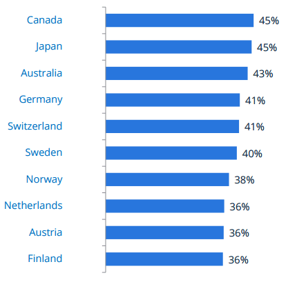 Promene u percepciji među globalnim potrošačima: desno je lista prvih deset. Neto vrednosti su izražene u procentima, dok procentualni iznos predstavlja razliku između pozitivnih promena raspoloženja kod potrošača umanjenih za negativan trend u promeni percepcije. Kanada (45%), Japan (43%) i Australija (43%) prednjače u pozitivnim promenama svog imidža među svetskim potrošačima.