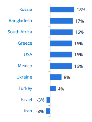Iran (-3%) i Izrael (-3%) na tabeli levo dobili su najmanje pozitivan trend pozitivne promene percepcije (ovaj trend je, u njihovom slučaju, zapravo, negativan). Dve supersile, Sjedinjene Države i Rusija nalaze se među državama koje su imale najslabiji trend pozitivne promene percepcije među globalnim potrošačima.