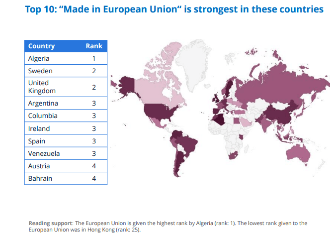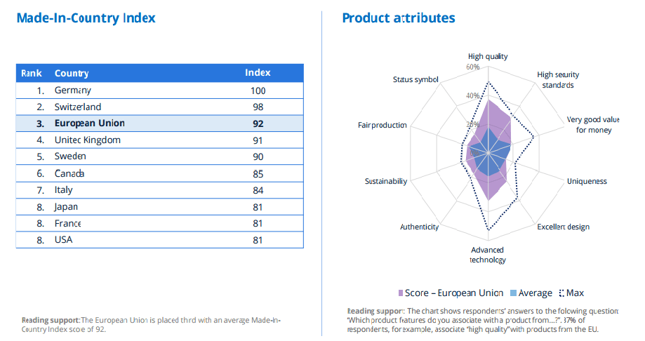 Etiketa “Made in EU” odnosno “Made in the EU” ima indeksni skor 92 koji ga smešta na treće mesto svetski najomiljenijih zemalja-proizvođača. Evropski proizvodi uživaju natprosečnu reputaciju po svim reperima koji se tiču karakteristika proizvoda: Kvalitet, tehnologija i bezbednosni standardi koji se primenjuju u proizvodnji su izuzetno dobro kotirani. Proizvodi s etiketom “Made in EU” su posebno visoko cenjeni izvan granica Evropske unije (naročito u zemljama Južne Amerike). Evropska unija je najniže rangirana među Kanađanima (na 23. mestu) i u Hong Kongu (25. pozicija), dok je najomiljenija među – Alžircima.