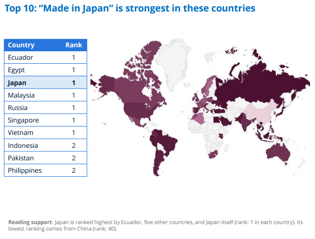 Japanske proizvode ne vole samo u Japanu, naprotiv. Proizvodi s etiketom “Made in Japan” plasirali su se na prvo, drugo i treće mesto u još 17 zemalja sveta. Oni važe za izuzetno kvalitetne, tehnološki najnaprednije i sa sjajnim odnosom kvalitet-cena. Po ovim osobinama, Japan je u samom vrhu svuda u svetu. Od opšte ocene i percepcije japanskih proizvoda jedino odudaraju kineski potrošači, koji su ih rangirali prilično nisko.
